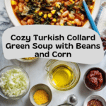 This traditional Turkish Collard Green Soup is a hearty and nutritious dish featuring tender collard greens, sweet corn, and partially cooked dried beans, all simmered together in a flavorful tomato base. Enhanced with a vibrant Aleppo pepper oil for a subtle kick, this rustic soup is perfect for a comforting meal rich in texture and taste.