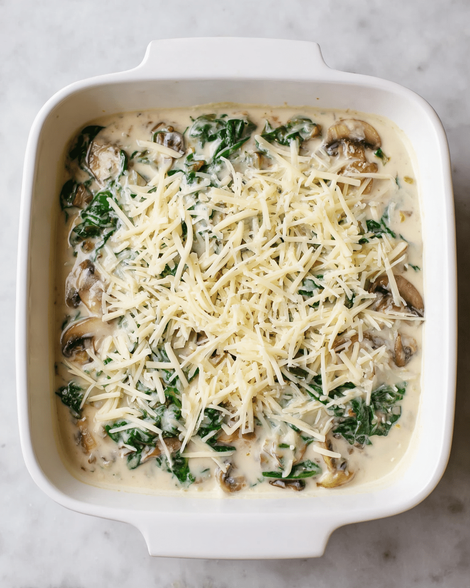 I make sure the mushroom and spinach mixture is well cooked and drained before layering.