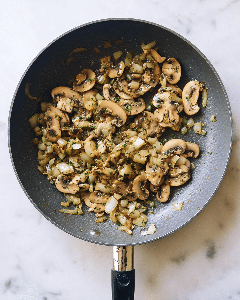 - In a large skillet, heat 2 tablespoons olive oil over medium heat. Add the chopped onion and cook for 3–4 minutes until softened.