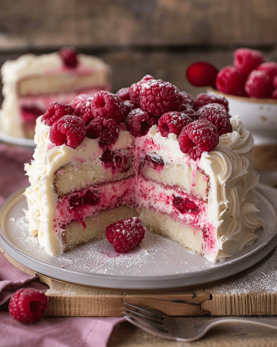 A stunning White Chocolate Raspberry Cake made with soft white cake layers, homemade raspberry jam, a vanilla milk soak, and a creamy white chocolate raspberry frosting. The balance of tart raspberries and sweet white chocolate makes it elegant and indulgent.