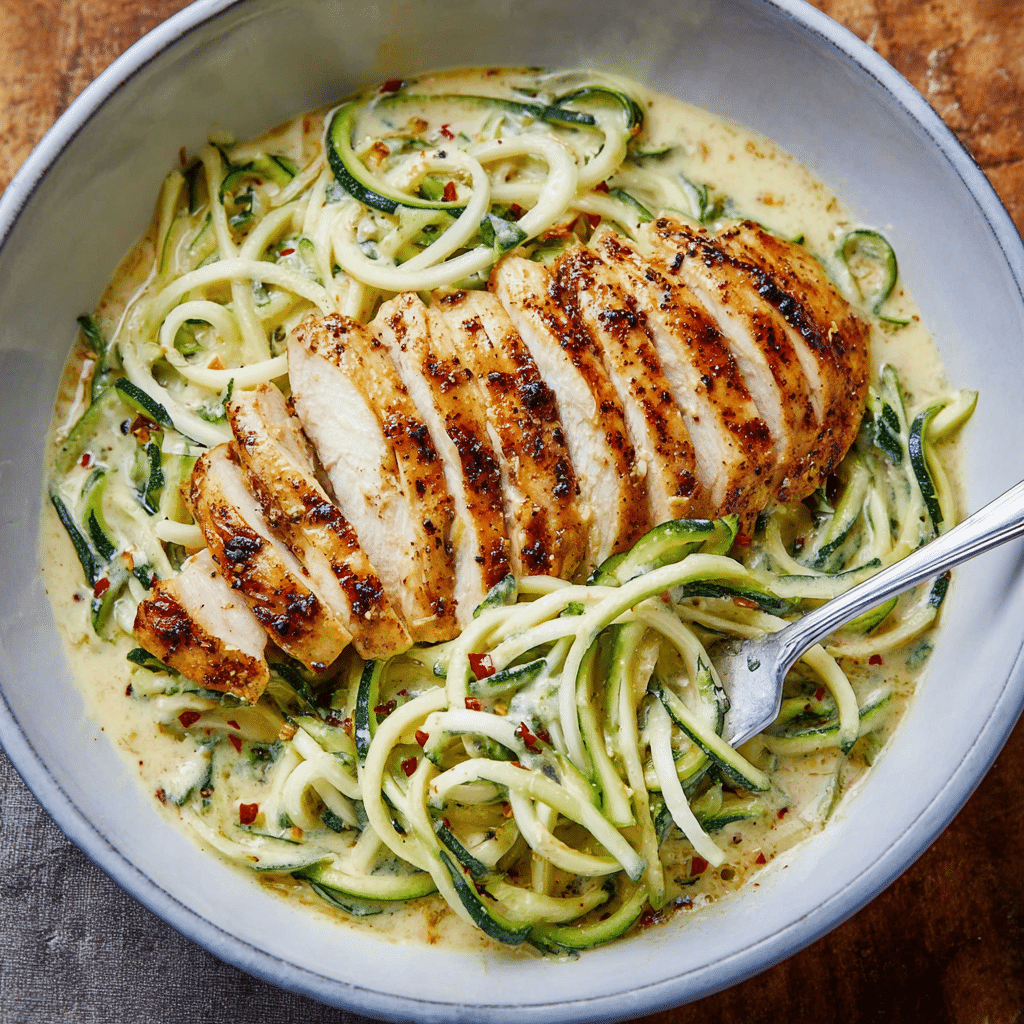 A lighter take on classic Alfredo, this dish features tender chicken and creamy Parmesan sauce tossed with fresh zucchini noodles for a comforting yet healthier dinner.